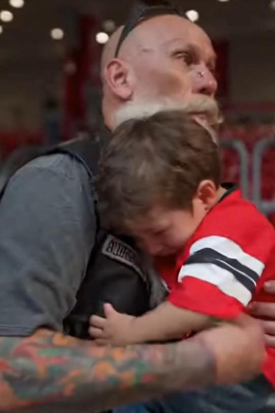 Instead of forcing movement, the biker placed a steady hand near the boy’s shoulder. Not grabbing. Not controlling.