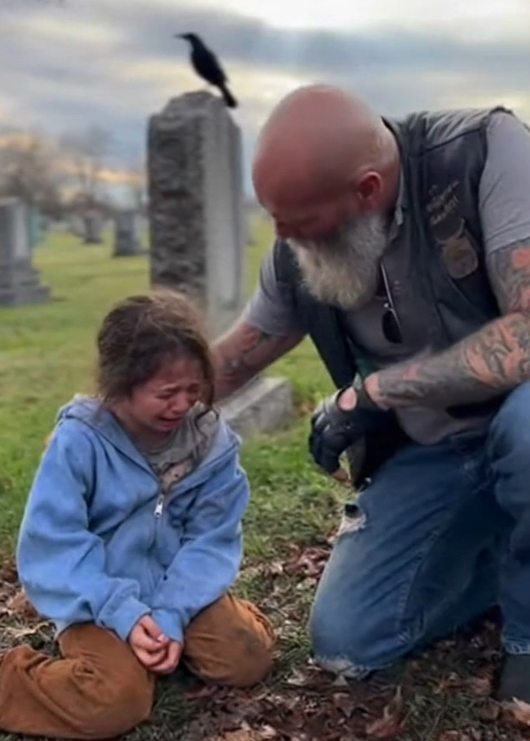 The biker didn’t shout across the grounds. He didn’t rush toward her or wave his arms. He walked calmly, stopping a few steps away so he wouldn’t startle her.