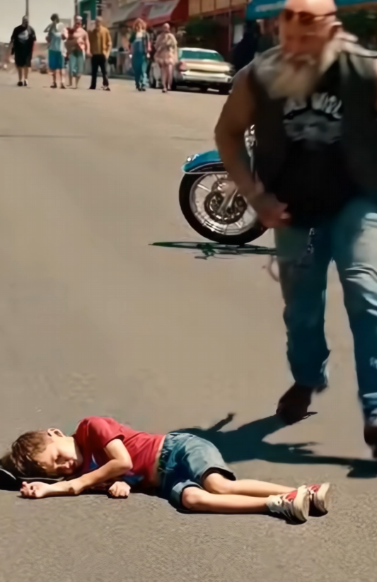 The biker dropped to his knees beside the boy, scanning the situation in seconds.
