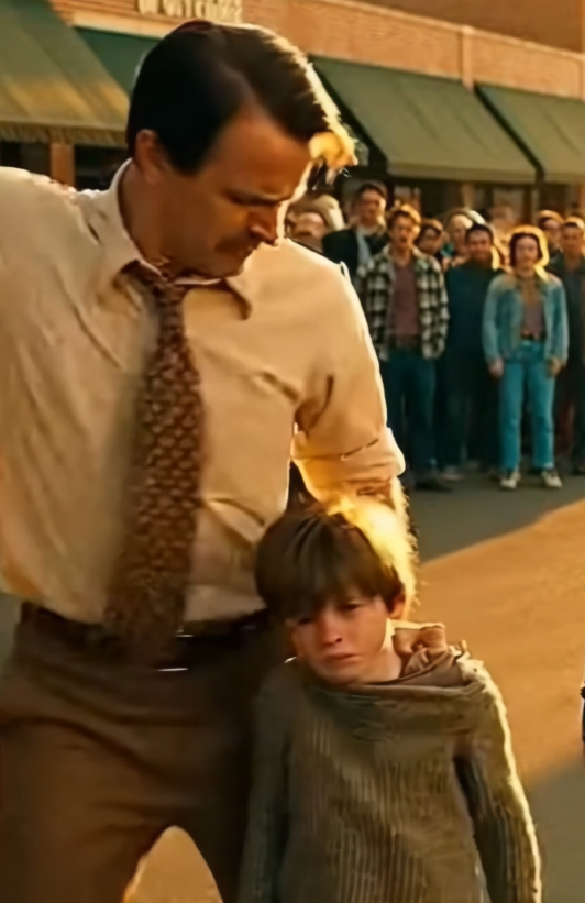 The boy looked small beneath the harsh tone directed at him. His shoulders were tense, and his hands hung stiffly at his sides.