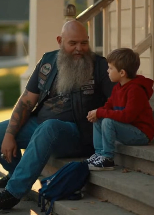 The driver glanced toward the porch, noticing the large biker sitting beside a young child.