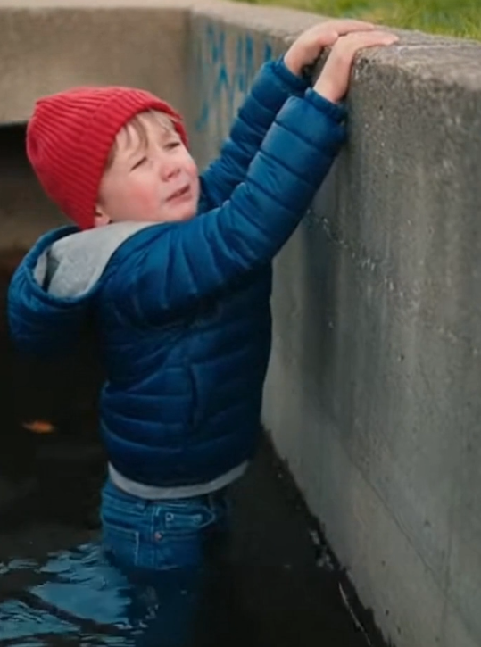 Mike studied the steep concrete sides for a moment. There was nothing nearby the boy could grab onto.