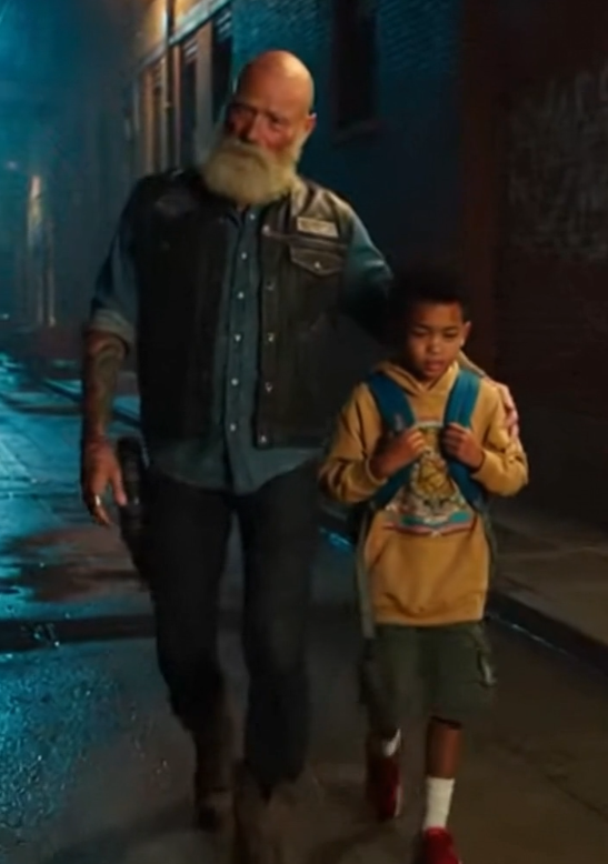 The man was large—broad shoulders, a weathered leather vest, and a gray-streaked beard that suggested years on the road. An American flag patch rested proudly on the back of his vest, shifting gently in the evening breeze.