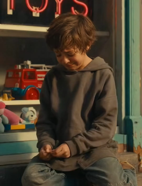 A kid standing alone outside a toy store, staring through the glass… that usually tells a story.
