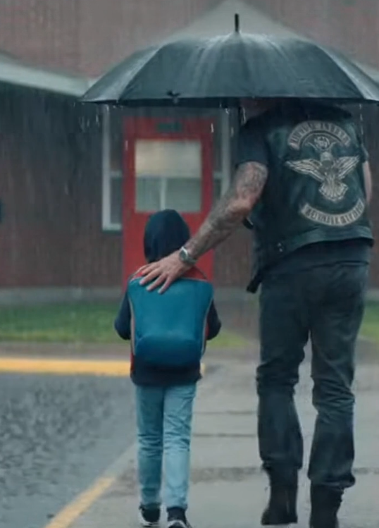 He carefully placed the jacket over the boy’s shoulders and guided him across the street toward the convenience store awning where the other bikers were waiting.