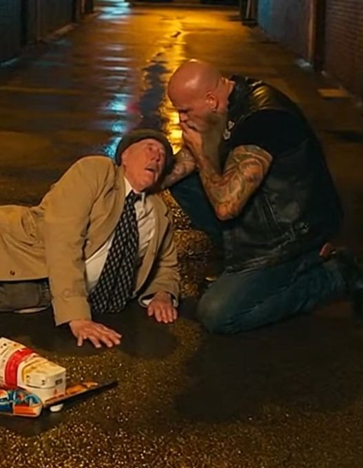 The night air was cold. The biker slipped off his jacket and draped it over the man’s shoulders, tucking it in gently like a blanket. He adjusted the collar to block the wind and made sure the man’s head rested comfortably.