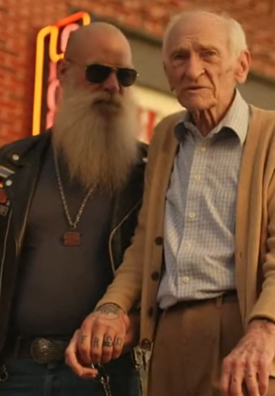 Inside, the smell of hot coffee and grilled food filled the air. The waitress looked up in surprise as the biker helped the fragile old man into a booth.