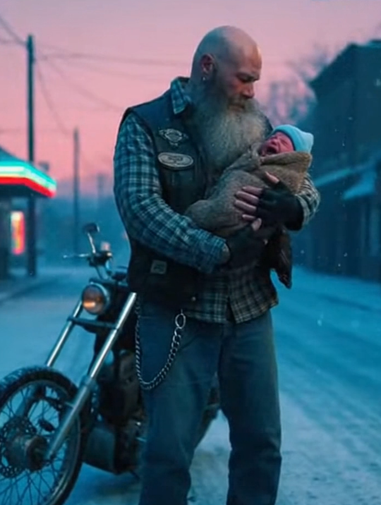 He quickly removed his heavy leather jacket and carefully lifted the baby from the cardboard box. His large, calloused hands held the child with incredible care as he wrapped the baby tightly against his chest.