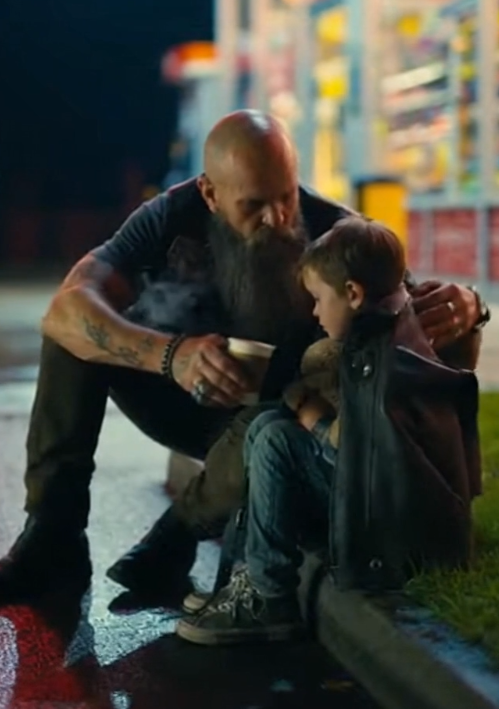 The biker crouched slightly, lowering himself to the boy’s level.