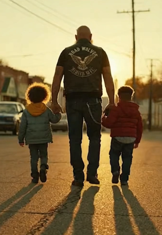 A black touring motorcycle eased to the curb. The rider wore a weathered leather vest, faded from years on open highways. His beard showed streaks of gray, and his boots hit the pavement with the kind of certainty that doesn’t need to announce itself.