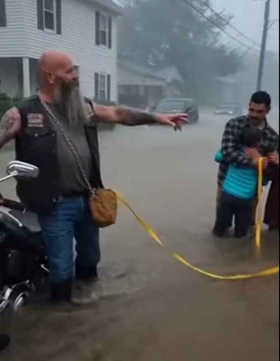 Hands locked tight on the steering wheel. Tires trembling. Water surged past the doors, threatening to rise higher with every second. The parents watched the biker’s signals closely—when to turn slightly, when to stay straight, when to keep going even when instinct screamed to stop.