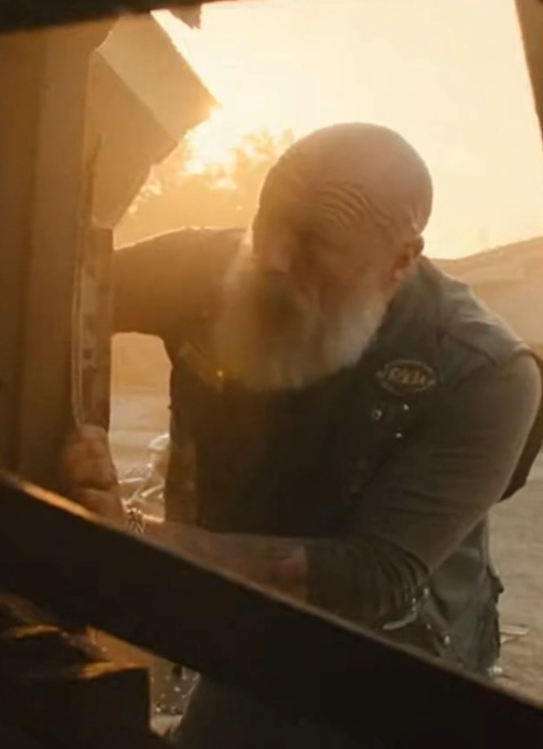 The biker swung again, harder this time. His grip slipped. His knuckles tore open further. The metal groaned, then cracked—just enough.