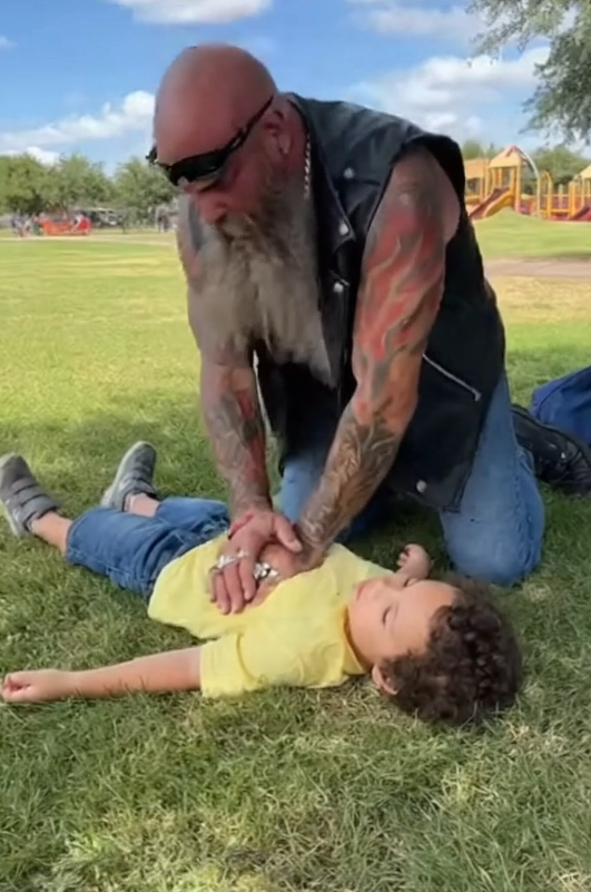 The biker stood up immediately and crossed the grass at a steady pace. He didn’t rush or shout. He moved with purpose—the kind of calm motion that comes from understanding that time matters, but panic doesn’t help.