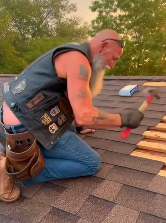 Within minutes, the biker was on the roof. His boots planted steady. His hands moved with purpose, even if roofing wasn’t his usual line of work. He nailed down loose boards, pulled a tarp over the worst of the damage, and secured it tight enough to keep the next rain out.