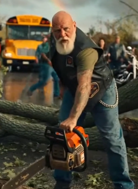The roar of motorcycle engines gave way to the growl of chainsaws and the sharp crack of breaking wood.