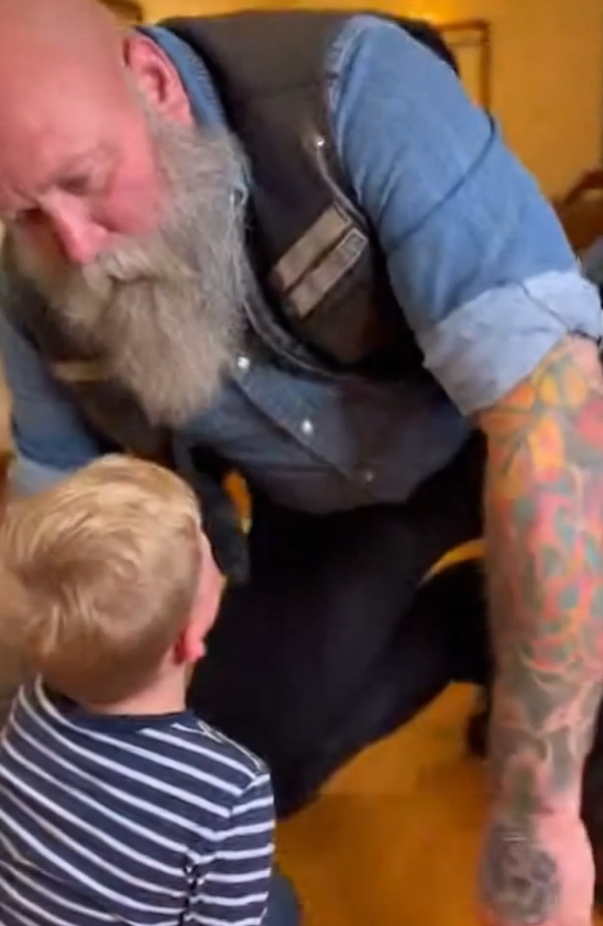 The boy buried his face into the biker’s shoulder, gripping his jacket tightly.