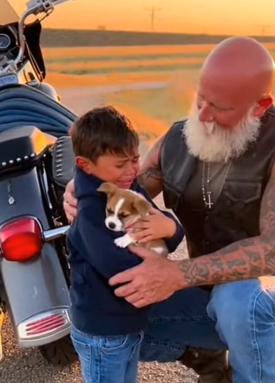 Around them, the other bikers smiled softly and stepped back, letting the moment belong to the kid and his dog.