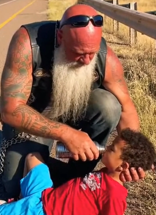 From his saddlebag, the biker pulled out a bottle of water. He tilted it slowly toward the boy’s lips.