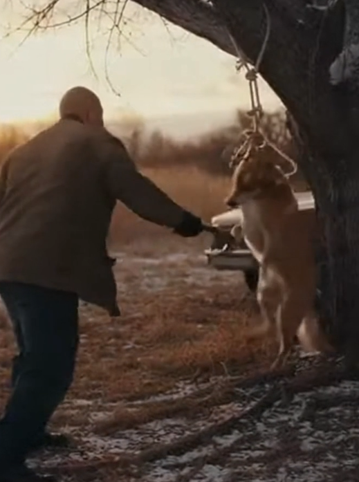 A thick rope was looped cruelly around his body, tied high to a tree branch. His legs kicked at empty air. His paws scraped at nothing. Each movement pulled the rope tighter, stealing what little strength he had left. His chest heaved. His eyes were wide with fear.