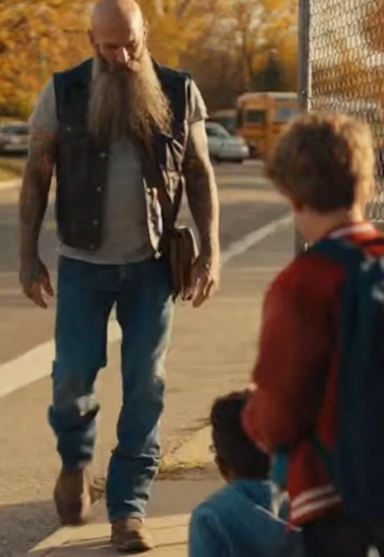 They noticed the boots first. Heavy. Planted. Then the leather vest. Road-worn. Then the fact that the man wasn’t angry or shouting.