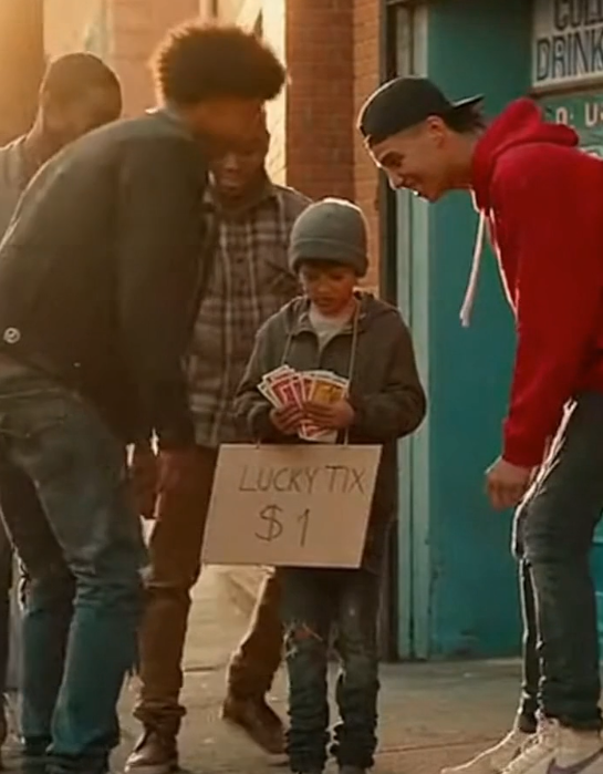 A small boy stood near the corner, clutching a stack of lottery tickets with hands that looked too young for the job. His shoes were worn thin, soles bending where they shouldn’t. His eyes stayed fixed on the ground, like he’d learned that looking up only invited trouble.