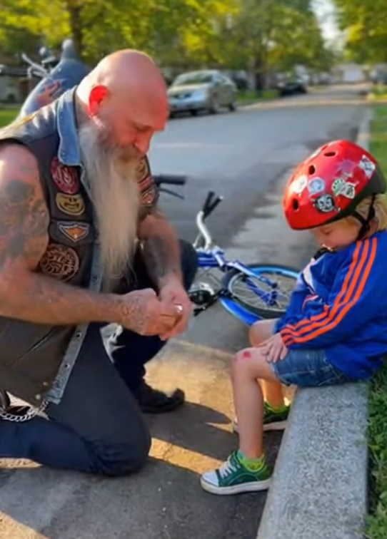 He walked over without rushing, giving the boy space to breathe. Adults towering over kids can feel overwhelming, especially when they’re already shaken. The biker understood that.