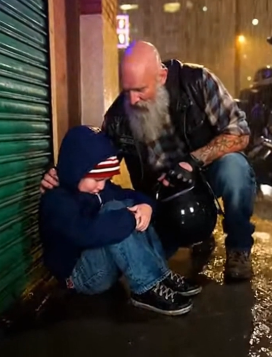 Engine off. Helmet off. Rain tapping steadily against leather and pavement like a slow drumbeat. As he walked closer, he saw the boy’s hands shaking—not from fear, but from cold. The kind of cold that sinks deep and steals energy.