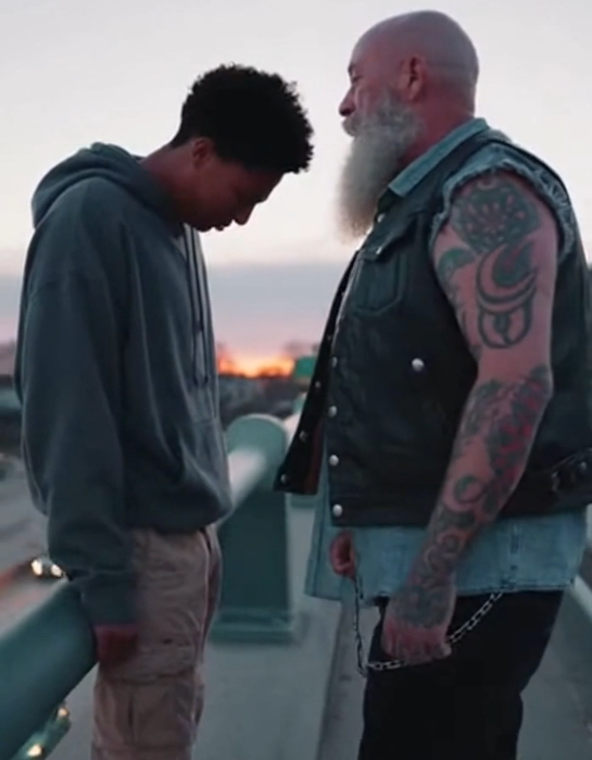 He parked a few yards back and took off his helmet, letting the night air cool his face. The city hummed below, loud and distant at the same time. He didn’t rush toward the young man. He walked slowly, boots soft against the concrete, giving space the way you do when someone’s thoughts are louder than words.