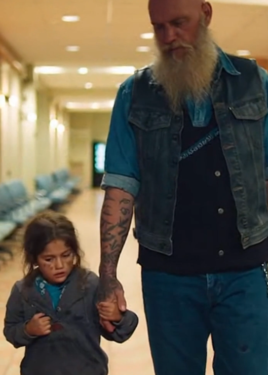 Across the street, a motorcycle slowed and pulled over. The engine cut, and the sudden quiet made the girl flinch. The rider removed his helmet, revealing tired eyes and a calm face shaped by years on the road. He noticed her instantly, the way people who’ve seen hardship tend to notice it fast.