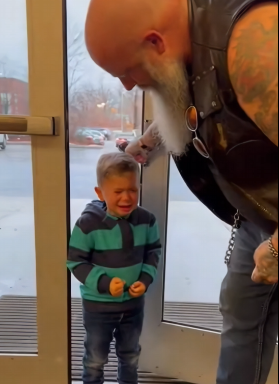 The boy’s eyes were wide, locked on the glass, locked on fear. The biker didn’t talk over him. He didn’t flood him with words. He stayed grounded, like an anchor in moving water.