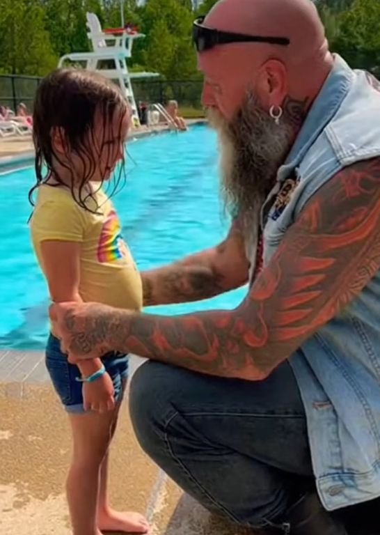 The biker leaned back and exhaled for the first time since he’d jumped into the pool. He stayed right where he was, one hand resting on the concrete near her, grounding her, letting her know she wasn’t alone.
