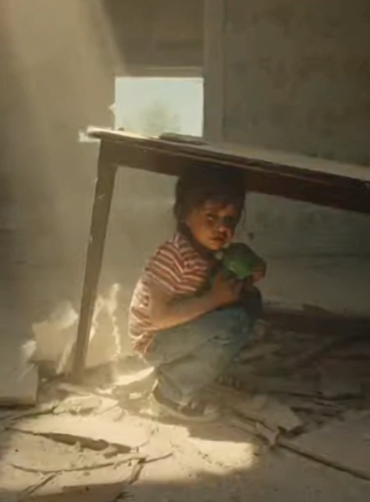 There, near a fallen couch, stood a small boy—maybe six years old. His clothes were covered in dust and his eyes were wide with fear.