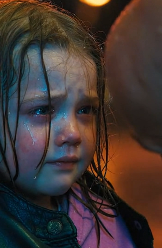 The rain had already soaked through her small jacket. Drops clung to her hair and rolled down her cheeks as she hugged her arms tightly around herself. The wind pushed cold sheets of rain across the street, making her shiver even more.