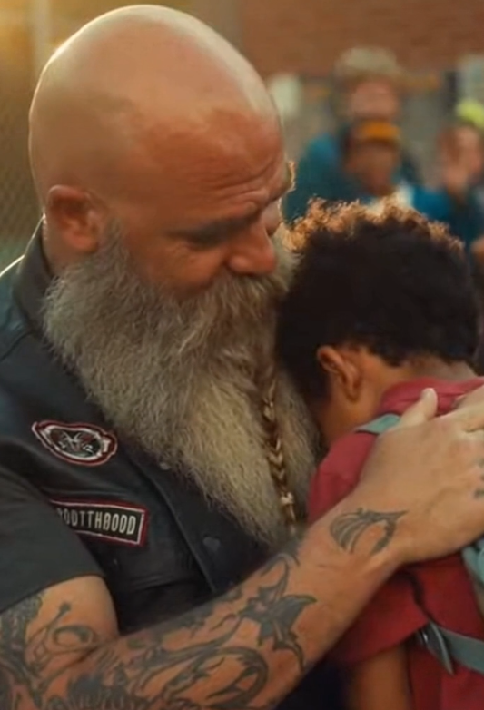 A black Harley-Davidson slowed as it passed the school gate. The rider—a broad-shouldered biker with a gray beard and a leather vest covered in road patches—noticed the small group gathered on the sidewalk.