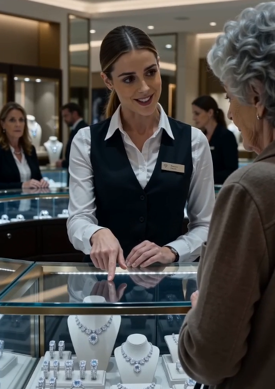 Her eyes drifted across the glass displays, catching the sparkle of diamonds under bright lights. She didn’t touch anything. She didn’t interrupt. She simply looked.