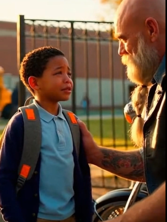 And just like that, a new chapter began. The next morning, Max was there, his Harley waiting at Lucas’s front door. The boy hesitated, still unsure, but climbed onto the bike, his oversized clothes flapping in the wind. Max started the engine, the deep rumble vibrating through the ground, and they sped off toward school. The wind whipped through their hair, and for the first time in a long while, Lucas felt a sense of freedom—a weight lifting off his small shoulders.