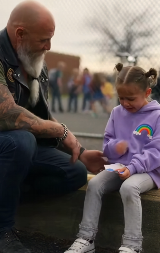 The biker slid off the stool and walked over. He didn’t stand over them. He pulled out a chair and sat backward on it, resting his arms across the top. Calm. Grounded. Present.