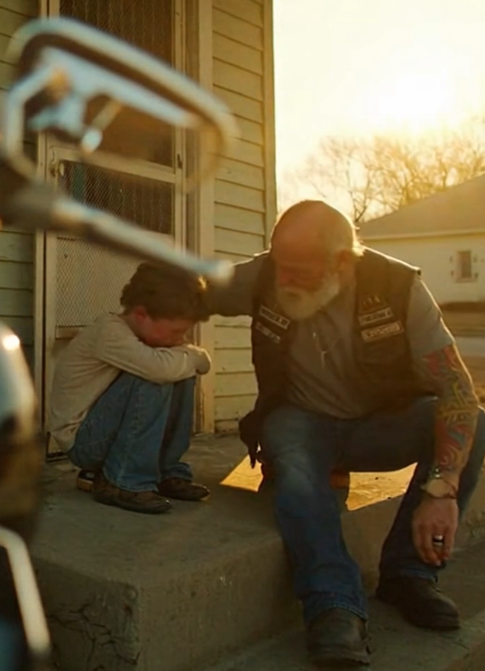 The biker noticed him sitting alone near a small park on the edge of town. The boy had his knees pulled to his chest, arms wrapped around himself, eyes tracking every movement around him.