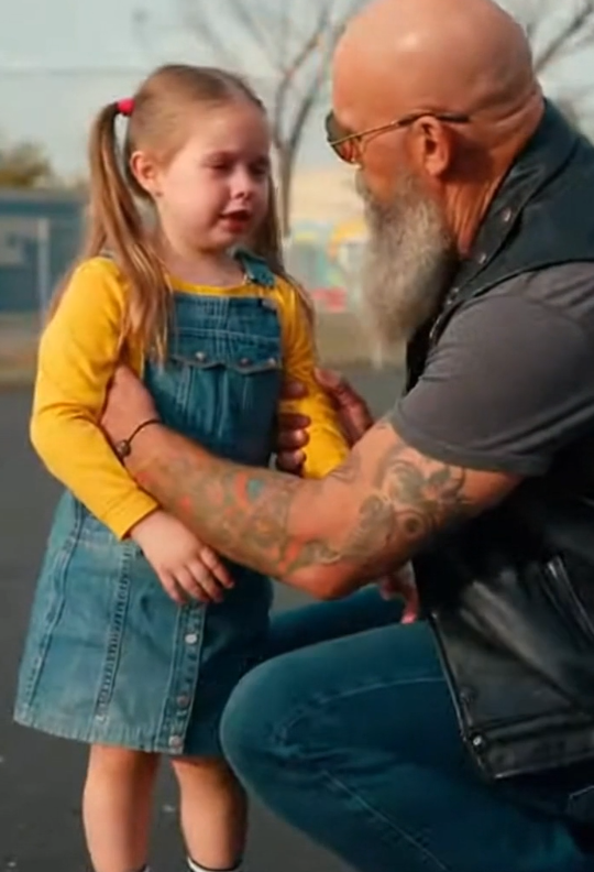 The girl nodded, eyes wide, cheeks burning. Her hands shook, betraying how hard she was trying to stay composed. The biker didn’t rush her. He waited until the shaking stopped before letting go, giving her time to catch her breath.