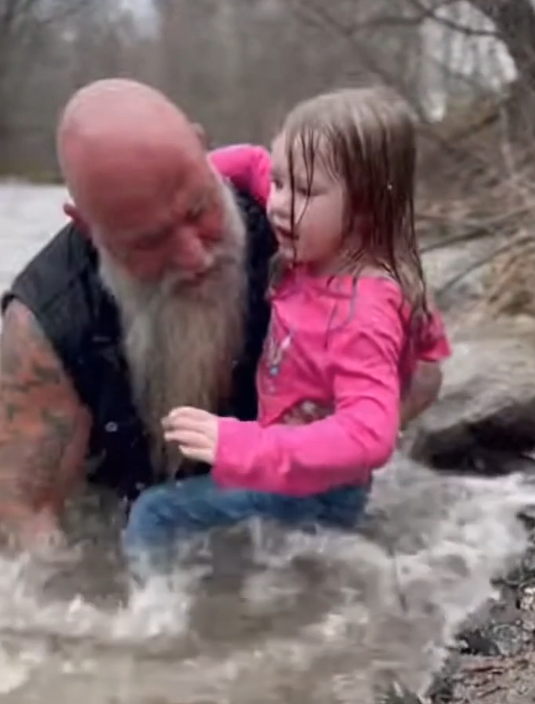 The biker lunged without thinking, stretching farther than was safe, grabbing her as the water dragged her past. His arm wrapped around her chest, tight enough to hold her, careful enough not to hurt her.