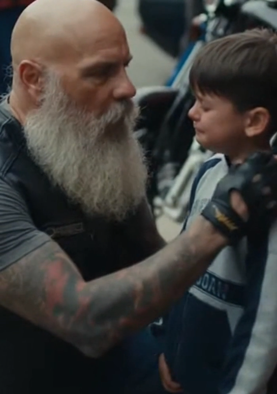 The biker rested his elbows on his knees and looked straight ahead, like the boy wasn’t on display. Like crying wasn’t something that needed fixing or correcting. The space between them felt steady, solid—unthreatening.