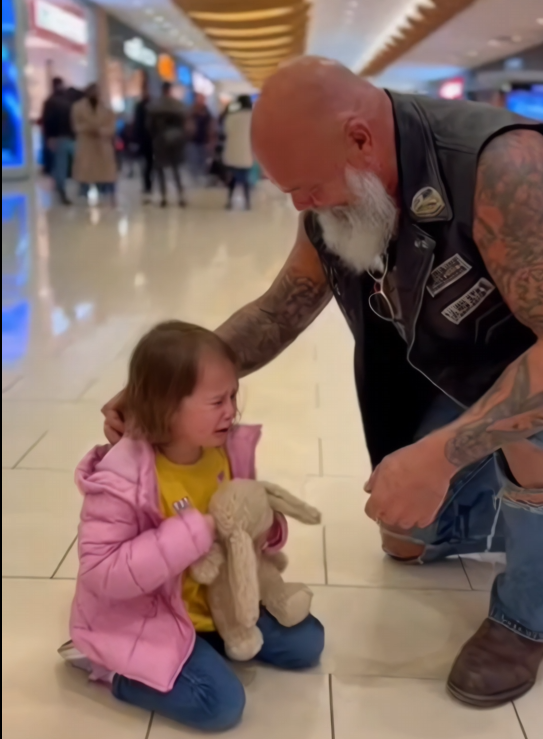 The biker stepped back just in time as mother and daughter collided, arms wrapping tight, relief pouring out where fear had been. The mother looked up at him, breathless, eyes wet.