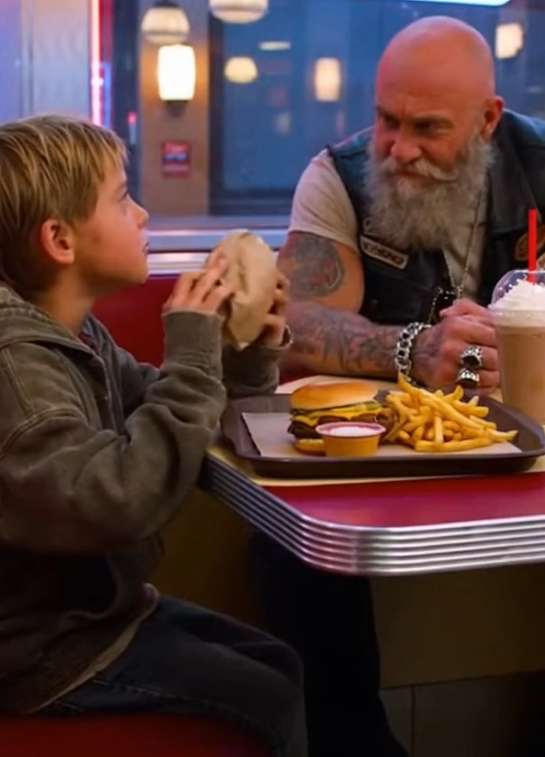 The boy looked about nine. Maybe ten. Too skinny. Too quiet. The kind of quiet that comes from learning early that asking doesn’t always help. Dan stood there with his helmet in hand, watching the kid pretend not to stare at people ordering food.