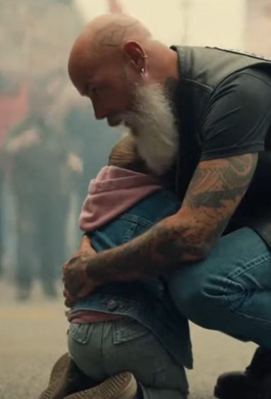 The biker moved slowly, guiding Ava and her sister behind him like a steady boat cutting through water. He didn’t shove anyone. He didn’t argue. He simply created space through presence and controlled movement.
