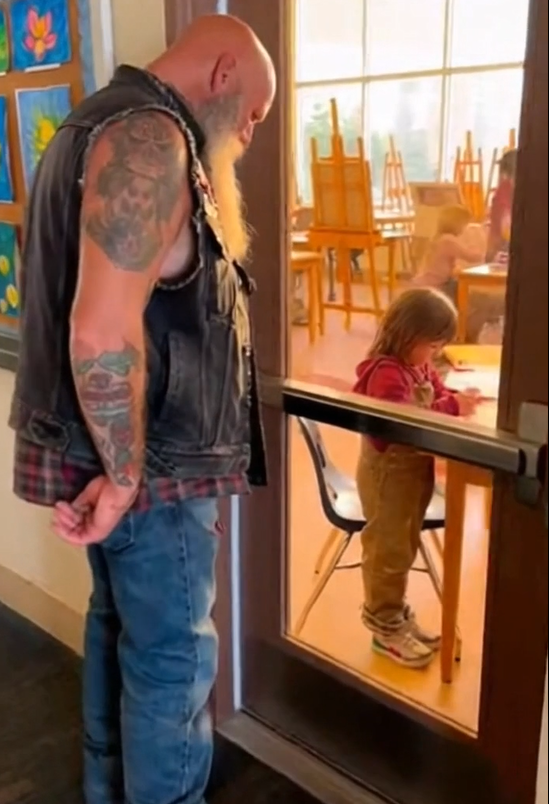 A motorcycle pulled up at the curb and went quiet. The biker removed his helmet and stretched his arms after the ride. He didn’t rush off. He didn’t check his phone. He noticed the girl right away—not because she was loud, but because she was focused.
