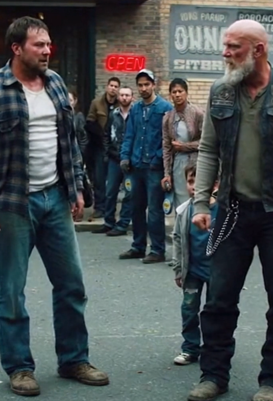 The biker crossed the street quickly but calmly. No running. No shouting. He placed himself between the man and the boy without touching either of them. His body language said enough before his words did.