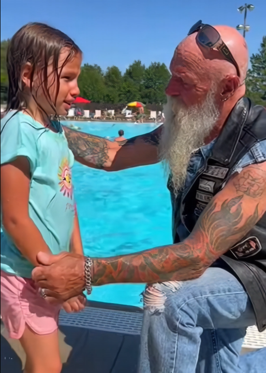 He grabbed her gently but firmly, pulling her to the pool’s edge. The lifeguard was still too far away, but the biker had already done the work.