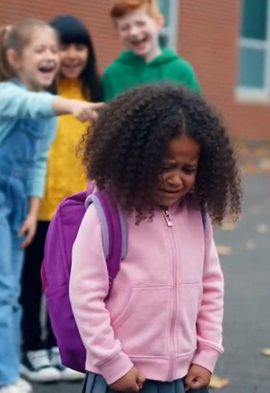 It was one of those warm afternoons where the air feels lazy and time moves slow. Outside a small-town American school, a young girl named Maya sat alone on the steps, dragging the toe of her sneaker through the dust. Her backpack rested beside her, unopened, like she had nowhere urgent to be. Around her, laughter floated through the air—but not the joyful kind. This laughter stung. It lingered. It pressed down on her chest.