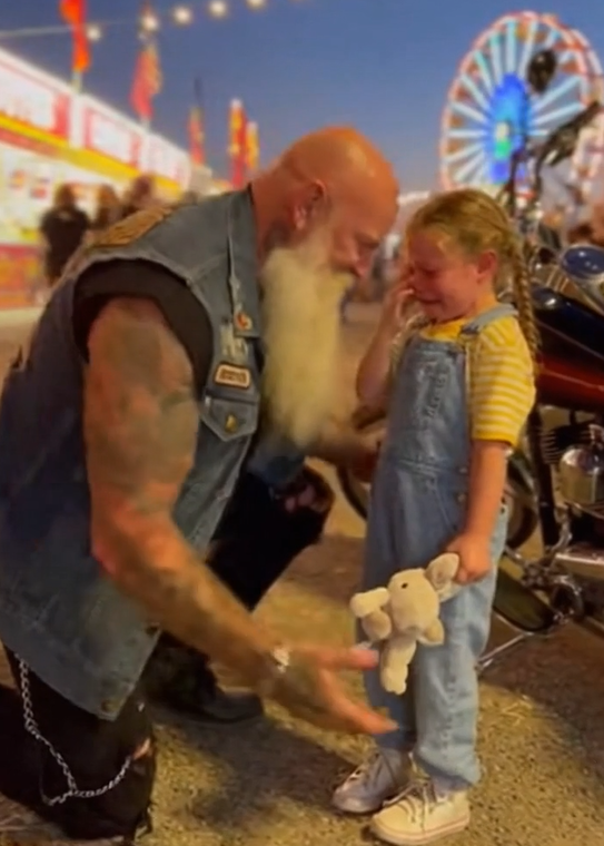 The biker stood up slowly, keeping his hands visible and his movements calm. He didn’t reach for her. He didn’t guide her by the shoulder. He simply stood beside her.