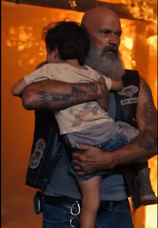 The leather jacket was scorched black. His arms were burned and shaking. And in his hands, held tight against his chest, was a small child.